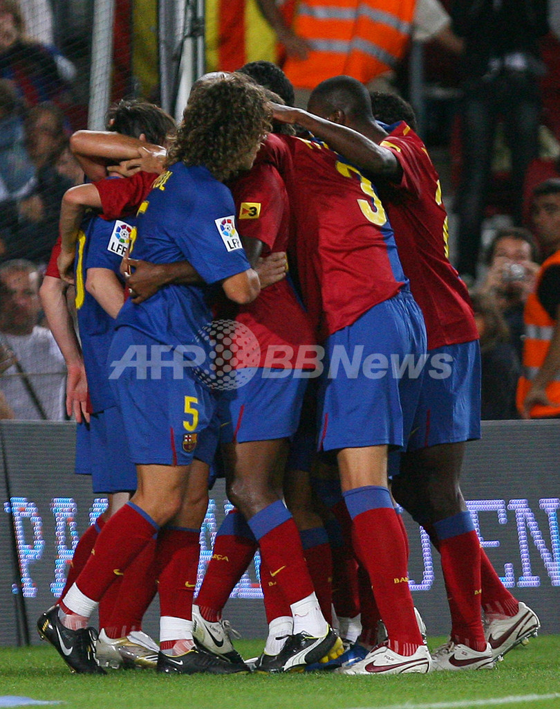 【9月14日 AFP】08-09スペイン1部リーグ第2節、FCバルセロナ(FC Barcelona)対ラシン・サンタンデール(Racing Santander)。試合は後半25分にリオネル・メッシ(Lionel Messi)がPKを決めてバルセロナが先制したが、同31分にホナタン・ペレイラ(Jonathan Pereira Rodriguez)に同点ゴールを決められ1-1の引き分けに終わり、バルセロナは本拠地でのリーグ開幕戦を白星で飾ることができなかった。(c)AFP/Phil Seery