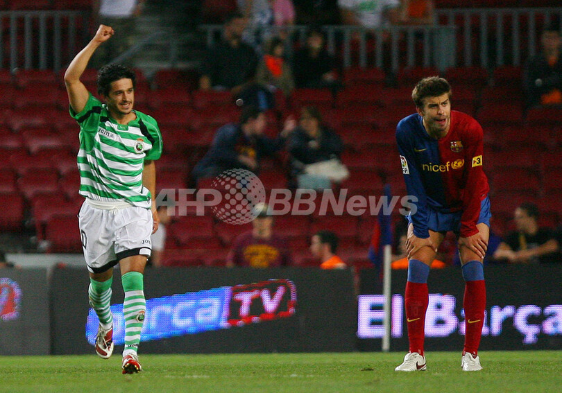 【9月14日 AFP】08-09スペイン1部リーグ第2節、FCバルセロナ(FC Barcelona)対ラシン・サンタンデール(Racing Santander)。試合は後半25分にリオネル・メッシ(Lionel Messi)がPKを決めてバルセロナが先制したが、同31分にホナタン・ペレイラ(Jonathan Pereira Rodriguez)に同点ゴールを決められ1-1の引き分けに終わり、バルセロナは本拠地でのリーグ開幕戦を白星で飾ることができなかった。(c)AFP/Phil Seery