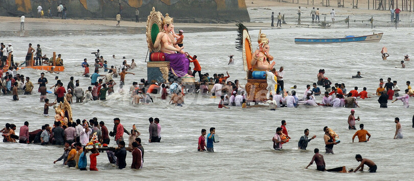 ニュース ライフ 「ガネーシャ祭」最終日、神さまは海へ川へ 2008年9月17日 8:02 発信地:ムンバイ/インド [ アジア・オセアニア インド ] このニュースをシェア ‹ › ❮ 6/26 ❯ インド西部ムンバイ(Mumbai)で行われたヒンズー教の祭り「ガネーシャ祭(Ganesha Festival)」で、アラビア海(Arabian sea)に入りガネーシャ神像を運ぶ信者ら(2008年9月14日撮影)。(c)AFP/Indranil MUKHERJEE 画像作成中 ! 【9月17日 AFP】インドで14日、10日間にわたるヒンズー教の祭り「ガネーシャ祭(Ganesha Festival)」が最終日を迎え、各地の海や川では、象の頭を持つガネーシャ神像を海や川に沈める儀式が行われた。この祭りは、西部の主要都市ムンバイ(Mumbai)や南部地域で盛んで、ムンバイでは、鮮やかな色彩の施された巨大な神像を大勢の信者が取り囲み、祭事の行われる海に向かって大通りを練り歩いた。(c)AFP ライフ 一覧へ> メディア・報道関係・法人の方向け 写真・動画 購入のお問合せ>