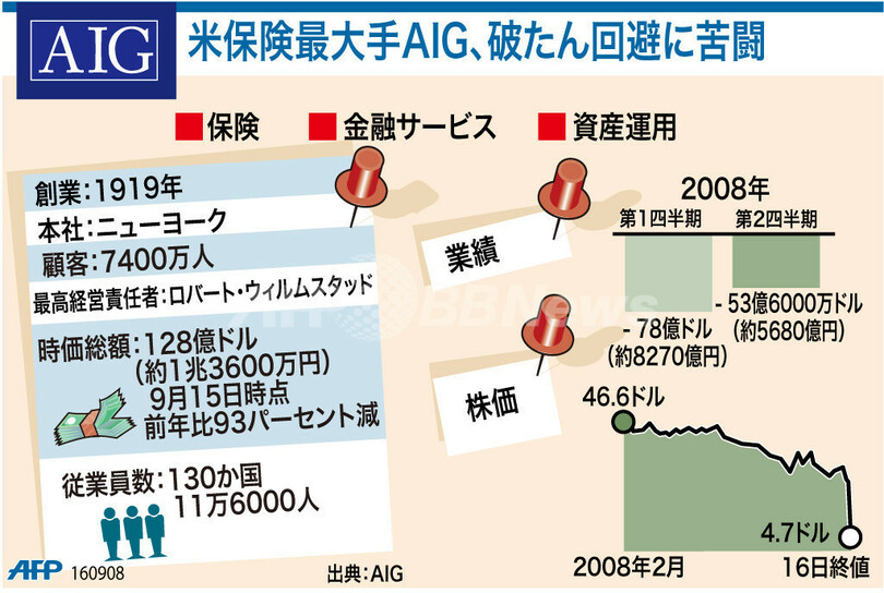 ニュース 政治・経済 図解 【図解】米保険最大手AIG 2008年9月17日 9:50 発信地:米国 [ 北米 米国 ] このニュースをシェア (c)AFP 【9月17日 AFP】図は、米保険最大手のアメリカン・インターナショナル・ グループ(American International Group、AIG)について示したもの。(c)AFP<ニュース解説画像一覧へ> 政治・経済 一覧へ> メディア・報道関係・法人の方向け 写真・動画 購入のお問合せ>