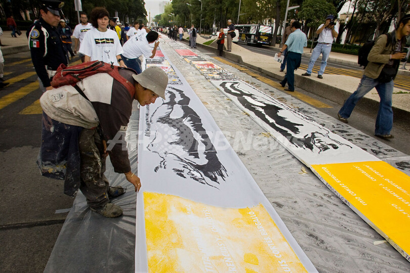 ニュース ライフ 長さ1000メートルの版画、メキシコ独立198周年記念イベントで登場 2008年9月17日 13:08 発信地:メキシコ市/メキシコ [ 中南米 メキシコ ] このニュースをシェア ‹ › ❮ 7/15 ❯ メキシコ市(Mexico City)のレフォルマ通り(Reforma Avenue)で長さ1000メートルを超える版画『メキシコの独立(Mexico's Independence)』を広げる人々(2008年9月15日撮影)。(c)AFP/Alfredo Estrella 画像作成中 ! 【9月17日 AFP】メキシコ首都メキシコ市(Mexico City)中心部のレフォルマ通り(Reforma Avenue)に展示された、1000メートルを超す版画。16日にメキシコが独立198年周年を迎えるにあたり、記念イベントの一環として制作された。アーティストや画家、数百人が参加し、『メキシコの独立(Mexico's Independence)』をテーマに、原板を彫り上げた。(c)AFP ライフ 一覧へ> メディア・報道関係・法人の方向け 写真・動画 購入のお問合せ>