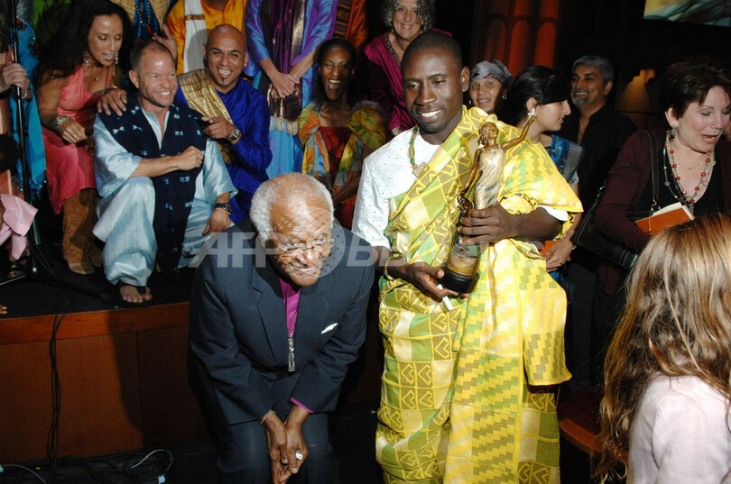 米カリフォルニア(California)州ロサンゼルス(Los Angeles)で開催された、2008 Freedom Awardsに出席した、南アフリカの英国国教会元大司教のデスモンド・ツツ(Desmond Tutu)氏(左)と受賞者のJames Kofi Annanさん(2008年9月15日撮影)。(c)AFP/Getty Images/Amy Graves