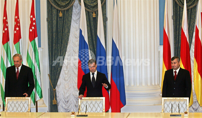 【9月18日 AFP】ロシアのドミトリー・メドベージェフ(Dmitry Medvedev)大統領は17日、前月に独立を承認したグルジア・南オセチア(South Ossetia)自治州およびアブハジア(Abkhazia)自治共和国との友好協力相互援助条約に調印した。これに対し、グルジア政府は「併合」だとして強く反発、米政府も強く非難した。