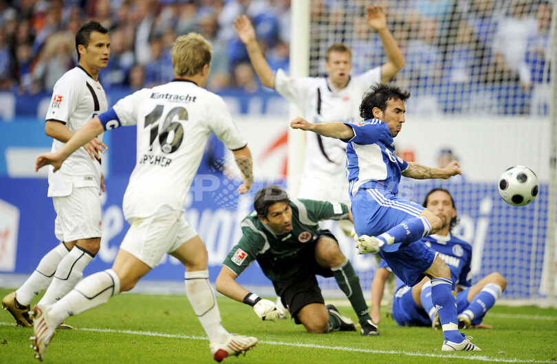 【9月21日 AFP】08-09ドイツ・ブンデスリーガ1部第5節、シャルケ04(Schalke04)対フランクフルト(Eintracht Frankfurt)。試合は10人になったフランクフルトのオウンゴールにより、シャルケが1-0で勝利を収めて暫定ながら首位に立った。