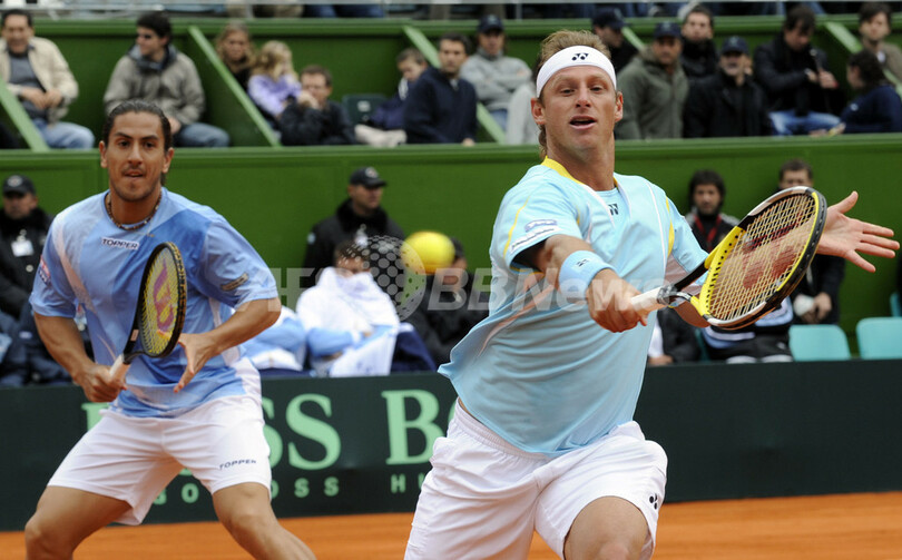【9月21日 AFP】男子テニス・デビスカップ(2008 Davis Cup)・ワールドグループ2008準決勝、アルゼンチン対ロシア。ロシアのイゴール・クニツィン(Igor Kunitsyn)/ドミトリー・ツルスノフ(Dmitry Tursunov)組は、第3試合のダブルスでアルゼンチンのギエルモ・カニャス(Guillermo Canas)/ダビド・ナルバンディアン(David Nalbandian)組と対戦。クニツィン/ツルスノフ組はセットカウント3-2(6-2、6-1、6-7、3-6、8-6)で勝利を収め、ロシアは通算成績を1勝2敗とした。(c)AFP