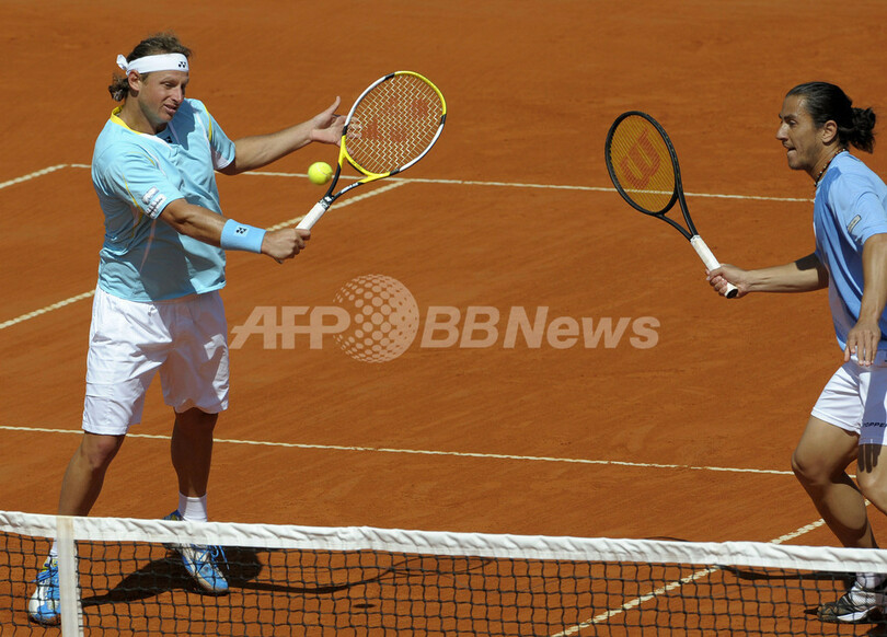 【9月21日 AFP】男子テニス・デビスカップ(2008 Davis Cup)・ワールドグループ2008準決勝、アルゼンチン対ロシア。ロシアのイゴール・クニツィン(Igor Kunitsyn)/ドミトリー・ツルスノフ(Dmitry Tursunov)組は、第3試合のダブルスでアルゼンチンのギエルモ・カニャス(Guillermo Canas)/ダビド・ナルバンディアン(David Nalbandian)組と対戦。クニツィン/ツルスノフ組はセットカウント3-2(6-2、6-1、6-7、3-6、8-6)で勝利を収め、ロシアは通算成績を1勝2敗とした。(c)AFP