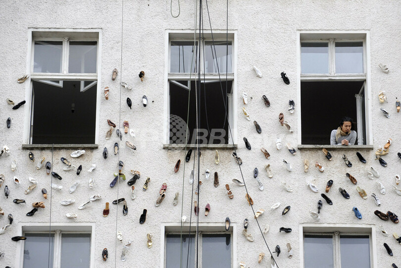 日本人アーティスト、ビルの壁一面に靴の作品 ベルリン