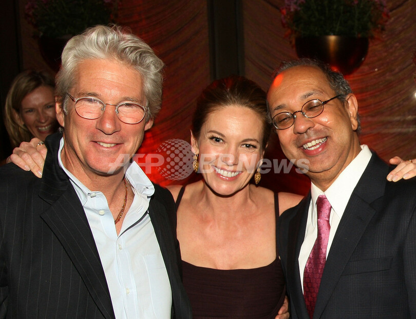 ニューヨーク(New York)のジーグフェルドシアター(Ziegfeld Theatre)で行われた映画『最後の初恋』(Nights in Rodanthe)』の上映会に登場した、(左から)出演俳優のリチャード・ギア(Richard Gere)、出演俳優のダイアン・レイン(Dian Lane)、監督のジョージ・C・ウルフ(George C. Wolfe、2008年9月23日撮影)。(c)Getty Images/Stephen Lovekin
