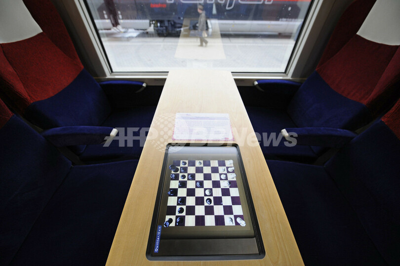 【9月25日 AFP】フランス国鉄(SNCF)開発の最新型列車「MooviTER」の車内に設置された、チェスなどのデジタルゲームが楽しめるタッチパネル式の画面がはめ込まれたテーブル。MooviTERは、ライブ情報画面や無線LANでインターネットに接続できる設備、幼児向けの遊び場などを備えた列車。ドイツのベルリン(Berlin)で23日に開幕した旅客・貨物輸送の見本市「イノトランス2008/国際鉄道技術専門見本市(Innotrans 2008)」に登場している。(c)AFP