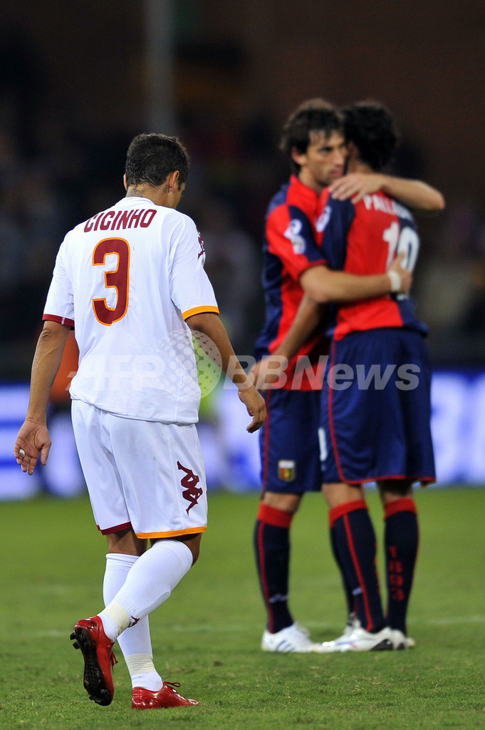 前半4分にジェノアのジュゼッペ・スクッリ(Giuseppe Sculli)に先制ゴールを許したローマは、同28分にダニエレ・デ・ロッシ(Daniele De Rossi)がゴールを決めて同点に追い着き、1-1で前半を折り返したが、後半に入りローマはディエゴ・ミリート(Diego Milito)のゴールでジェノアに勝ち越を許すと、その後デ・ロッシがこの試合2枚目のイエローカードを受けて退場処分となり、後半43分には再びミリートに追加点を決められた。(c)AFP/Barnaby Chesterman