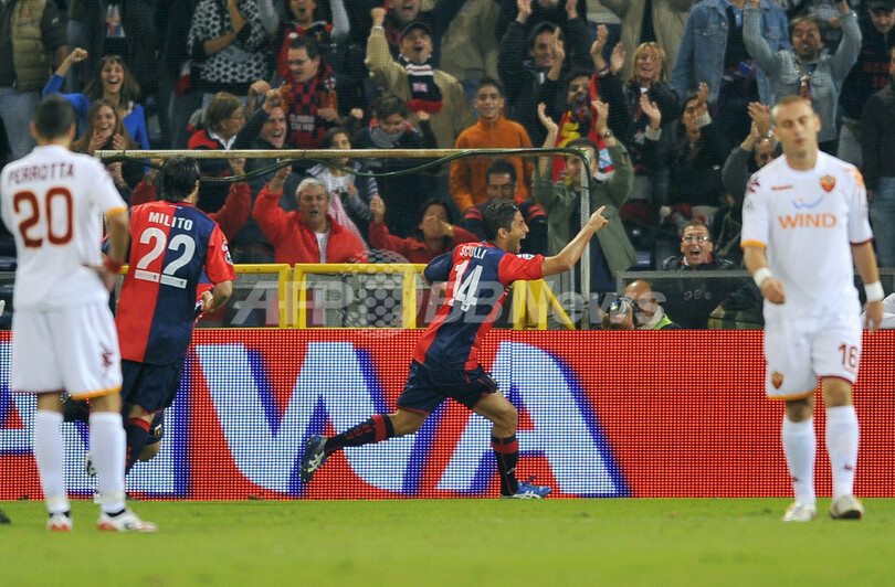 前半4分にジェノアのジュゼッペ・スクッリ(Giuseppe Sculli)に先制ゴールを許したローマは、同28分にダニエレ・デ・ロッシ(Daniele De Rossi)がゴールを決めて同点に追い着き、1-1で前半を折り返したが、後半に入りローマはディエゴ・ミリート(Diego Milito)のゴールでジェノアに勝ち越を許すと、その後デ・ロッシがこの試合2枚目のイエローカードを受けて退場処分となり、後半43分には再びミリートに追加点を決められた。(c)AFP/Barnaby Chesterman