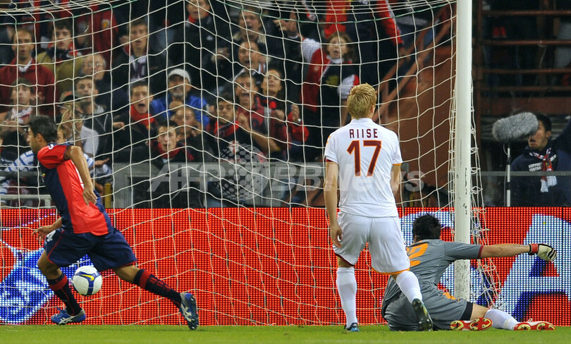 前半4分にジェノアのジュゼッペ・スクッリ(Giuseppe Sculli)に先制ゴールを許したローマは、同28分にダニエレ・デ・ロッシ(Daniele De Rossi)がゴールを決めて同点に追い着き、1-1で前半を折り返したが、後半に入りローマはディエゴ・ミリート(Diego Milito)のゴールでジェノアに勝ち越を許すと、その後デ・ロッシがこの試合2枚目のイエローカードを受けて退場処分となり、後半43分には再びミリートに追加点を決められた。(c)AFP/Barnaby Chesterman