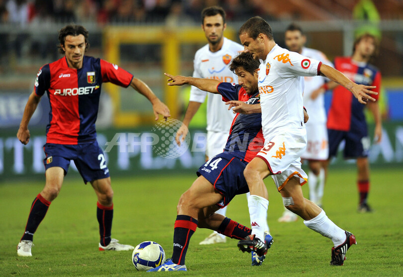 前半4分にジェノアのジュゼッペ・スクッリ(Giuseppe Sculli)に先制ゴールを許したローマは、同28分にダニエレ・デ・ロッシ(Daniele De Rossi)がゴールを決めて同点に追い着き、1-1で前半を折り返したが、後半に入りローマはディエゴ・ミリート(Diego Milito)のゴールでジェノアに勝ち越を許すと、その後デ・ロッシがこの試合2枚目のイエローカードを受けて退場処分となり、後半43分には再びミリートに追加点を決められた。(c)AFP/Barnaby Chesterman
