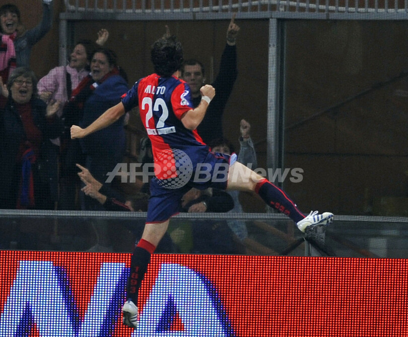 前半4分にジェノアのジュゼッペ・スクッリ(Giuseppe Sculli)に先制ゴールを許したローマは、同28分にダニエレ・デ・ロッシ(Daniele De Rossi)がゴールを決めて同点に追い着き、1-1で前半を折り返したが、後半に入りローマはディエゴ・ミリート(Diego Milito)のゴールでジェノアに勝ち越を許すと、その後デ・ロッシがこの試合2枚目のイエローカードを受けて退場処分となり、後半43分には再びミリートに追加点を決められた。(c)AFP/Barnaby Chesterman