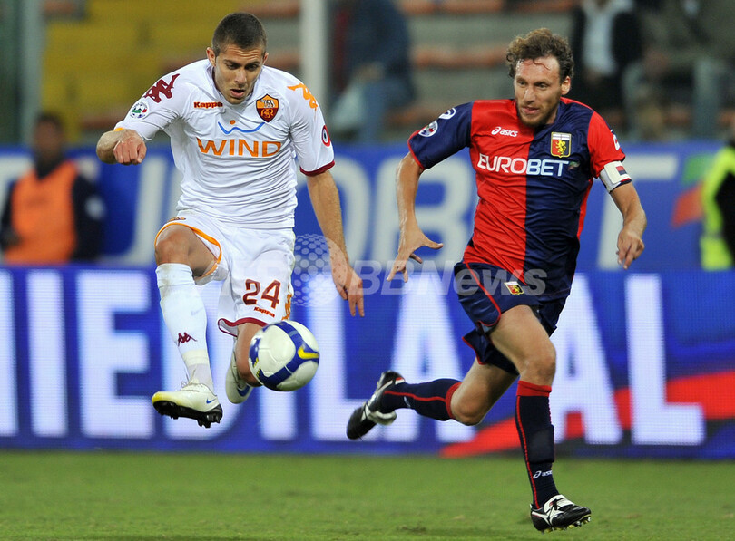 前半4分にジェノアのジュゼッペ・スクッリ(Giuseppe Sculli)に先制ゴールを許したローマは、同28分にダニエレ・デ・ロッシ(Daniele De Rossi)がゴールを決めて同点に追い着き、1-1で前半を折り返したが、後半に入りローマはディエゴ・ミリート(Diego Milito)のゴールでジェノアに勝ち越を許すと、その後デ・ロッシがこの試合2枚目のイエローカードを受けて退場処分となり、後半43分には再びミリートに追加点を決められた。(c)AFP/Barnaby Chesterman