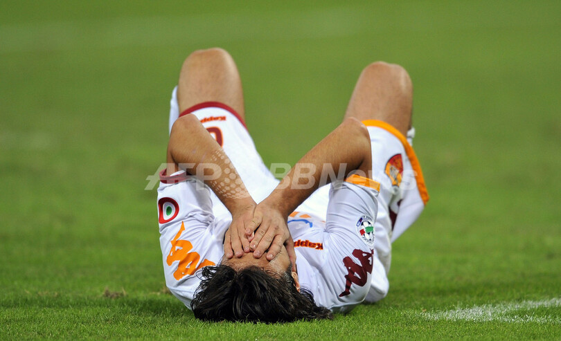 前半4分にジェノアのジュゼッペ・スクッリ(Giuseppe Sculli)に先制ゴールを許したローマは、同28分にダニエレ・デ・ロッシ(Daniele De Rossi)がゴールを決めて同点に追い着き、1-1で前半を折り返したが、後半に入りローマはディエゴ・ミリート(Diego Milito)のゴールでジェノアに勝ち越を許すと、その後デ・ロッシがこの試合2枚目のイエローカードを受けて退場処分となり、後半43分には再びミリートに追加点を決められた。(c)AFP/Barnaby Chesterman