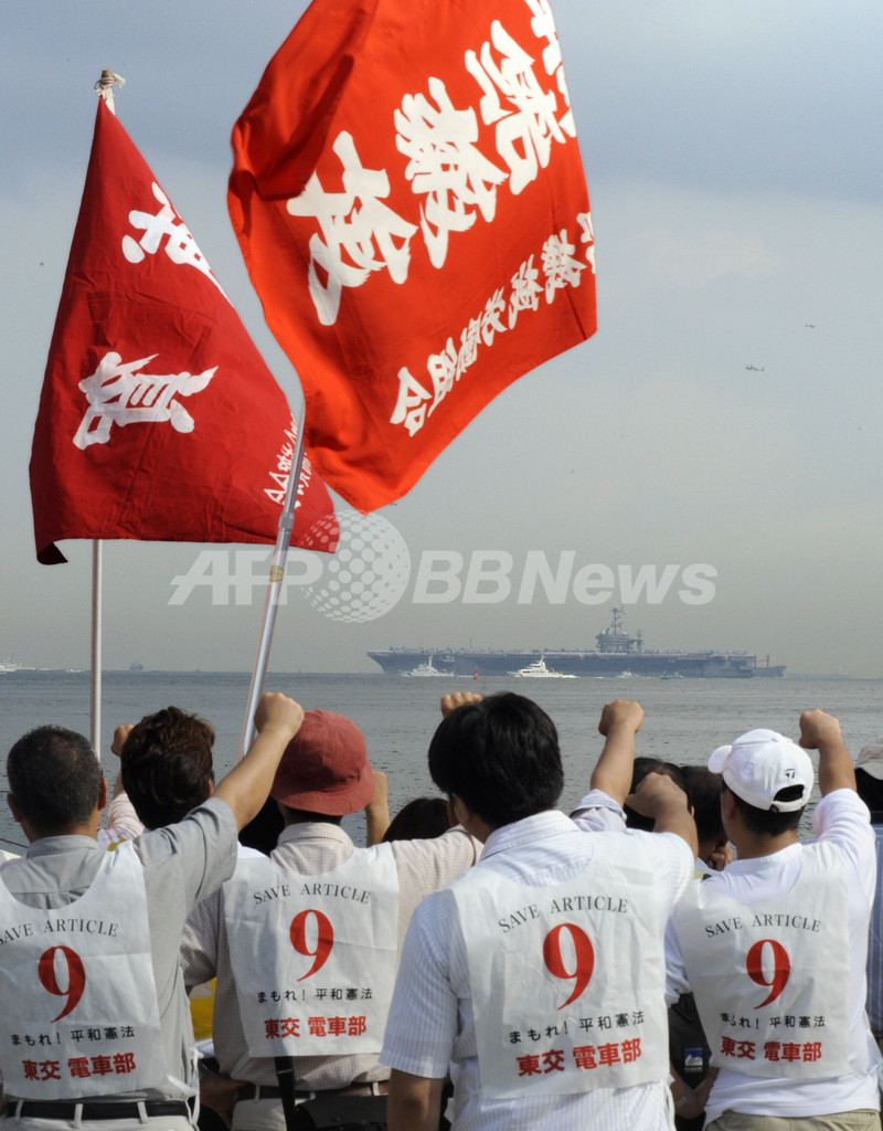 ニュース 政治・経済 米原子力空母ジョージ・ワシントン、横須賀に入港 2008年9月25日 10:47 発信地:神奈川 [ アジア・オセアニア 神奈川 ] このニュースをシェア ‹ › ❮ 13/13 ❯ 米軍横須賀基地に入港する米原子力空母ジョージ・ワシントン(George Washington)と抗議する人々(2008年9月25日撮影)。(c)AFP/Kazuhiro NOGI 画像作成中 ! 【9月25日 AFP】米原子力空母ジョージ・ワシントン(George Washington)は25日、米軍横須賀基地に入港した。米軍関係者ら約2000人が米国旗や風船、リボンを手にした大勢の人々が入港を歓迎し、音楽が鳴らされ、ドックは祝賀ムードに包まれた。一方、近隣住民や市民団体らによる抗議活動も行われた。(c)AFP 政治・経済 一覧へ> メディア・報道関係・法人の方向け 写真・動画 購入のお問合せ>