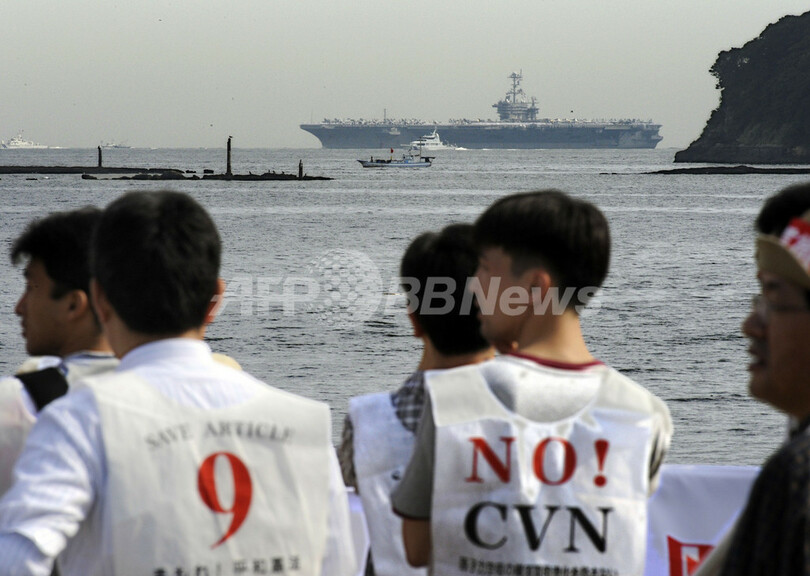 ニュース 政治・経済 米原子力空母ジョージ・ワシントン、横須賀に入港 2008年9月25日 10:47 発信地:神奈川 [ アジア・オセアニア 神奈川 ] このニュースをシェア ‹ › ❮ 12/13 ❯ 米軍横須賀基地に入港する米原子力空母ジョージ・ワシントン(George Washington)と抗議する人々(2008年9月25日撮影)。(c)AFP/Kazuhiro NOGI 画像作成中 ! 【9月25日 AFP】米原子力空母ジョージ・ワシントン(George Washington)は25日、米軍横須賀基地に入港した。米軍関係者ら約2000人が米国旗や風船、リボンを手にした大勢の人々が入港を歓迎し、音楽が鳴らされ、ドックは祝賀ムードに包まれた。一方、近隣住民や市民団体らによる抗議活動も行われた。(c)AFP 政治・経済 一覧へ> メディア・報道関係・法人の方向け 写真・動画 購入のお問合せ>