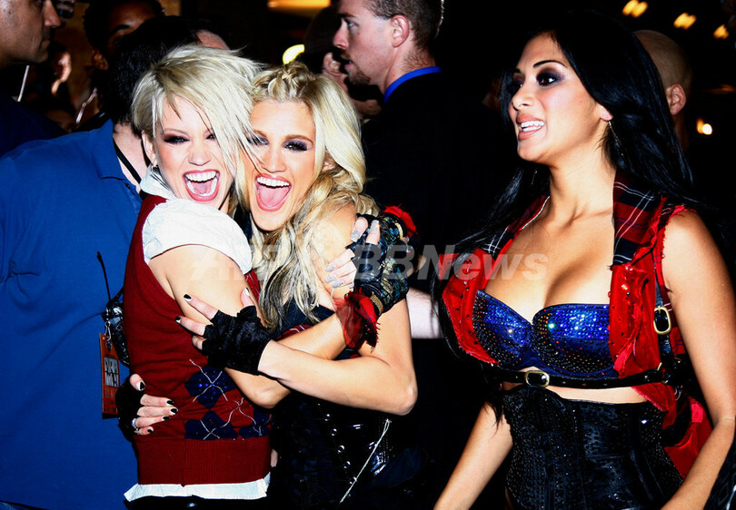 米カリフォルニア(california)州ハリウッド(Hollywood)の大手レコード店ヴァージン・メガストア(Virgin Mega Store)で、ニューアルバム『ドール・ドミネーション(Doll Domination)』のプロモーションを行う、プッシーキャット・ドールズ(The Pussycat Dolls)の(左から)キンバリー・ワイヤット(Kimberly Wyatt)、アシュリー・ロバーツ(Ashley Roberts)、ニコールシャージンガー(Nicole Scherzinger、2008年9月23日撮影)。(c)AFP/Getty Images/Frazer Harrison