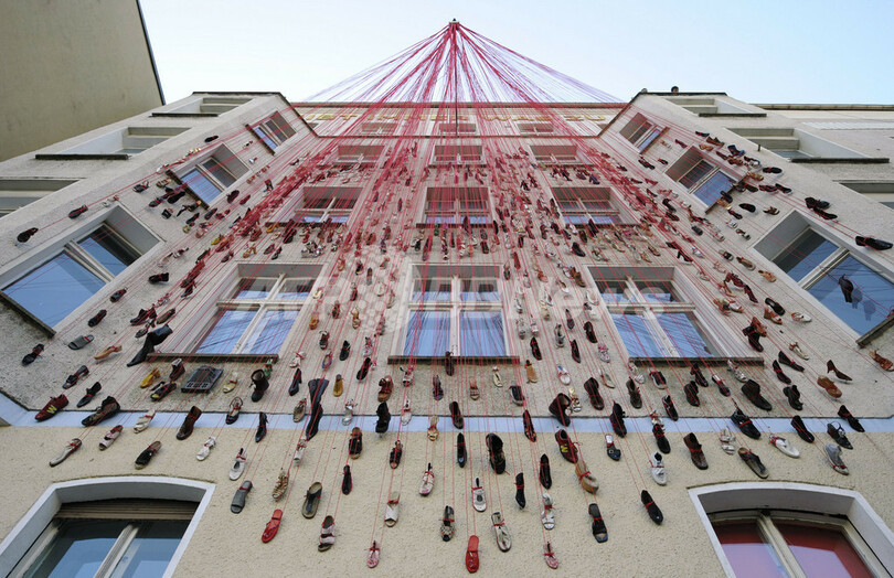 【9月26日 AFP】ドイツの首都ベルリン(Berlin)で27日から開催の芸術展「Torstrasse 166 - House of Imagination」に出典された作品。建物の外壁一面に無数の靴を張り付けたもので、一種で制作者はベルリン在住の日本人アーティスト、塩田千春(Chiharu Shiota)さん。同展では、このビルを使ってさまざまな芸術家の作品を展示する。会期は10月12日まで。(c)AFP
