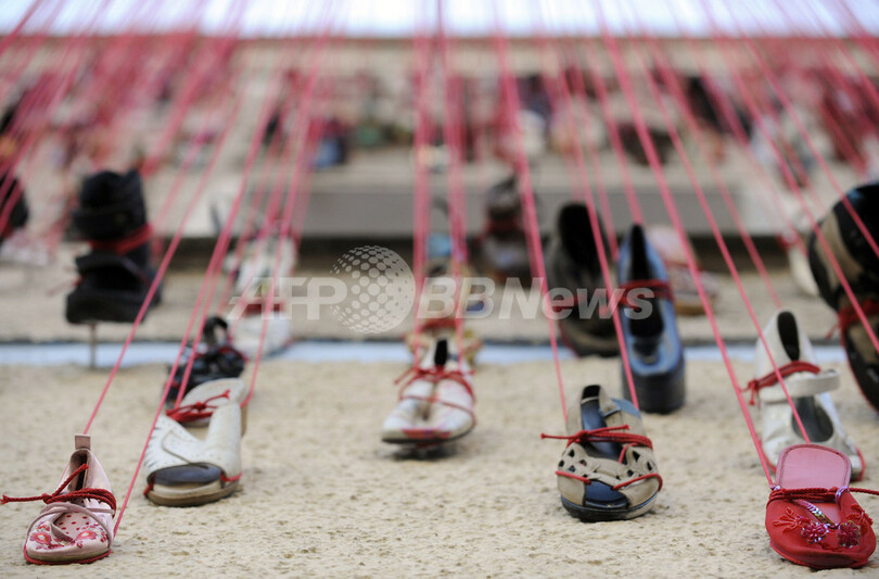 【9月26日 AFP】ドイツの首都ベルリン(Berlin)で27日から開催の芸術展「Torstrasse 166 - House of Imagination」に出典された作品。建物の外壁一面に無数の靴を張り付けたもので、一種で制作者はベルリン在住の日本人アーティスト、塩田千春(Chiharu Shiota)さん。同展では、このビルを使ってさまざまな芸術家の作品を展示する。会期は10月12日まで。(c)AFP