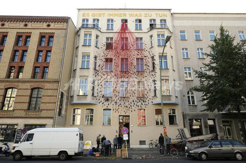 【9月26日 AFP】ドイツの首都ベルリン(Berlin)で27日から開催の芸術展「Torstrasse 166 - House of Imagination」に出典された作品。建物の外壁一面に無数の靴を張り付けたもので、一種で制作者はベルリン在住の日本人アーティスト、塩田千春(Chiharu Shiota)さん。同展では、このビルを使ってさまざまな芸術家の作品を展示する。会期は10月12日まで。(c)AFP