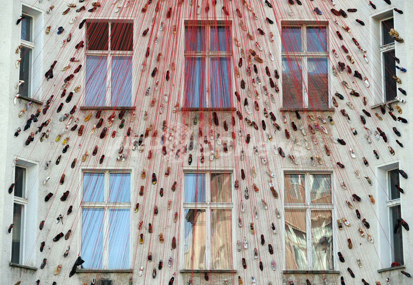 【9月26日 AFP】ドイツの首都ベルリン(Berlin)で27日から開催の芸術展「Torstrasse 166 - House of Imagination」に出典された作品。建物の外壁一面に無数の靴を張り付けたもので、一種で制作者はベルリン在住の日本人アーティスト、塩田千春(Chiharu Shiota)さん。同展では、このビルを使ってさまざまな芸術家の作品を展示する。会期は10月12日まで。(c)AFP