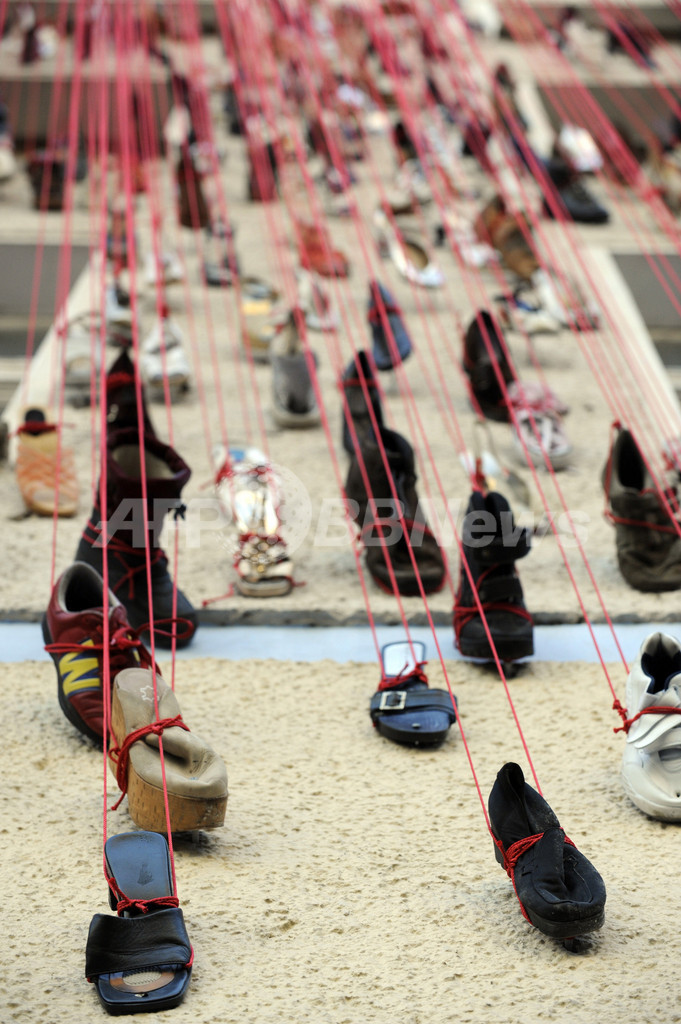 【9月26日 AFP】ドイツの首都ベルリン(Berlin)で27日から開催の芸術展「Torstrasse 166 - House of Imagination」に出典された作品。建物の外壁一面に無数の靴を張り付けたもので、一種で制作者はベルリン在住の日本人アーティスト、塩田千春(Chiharu Shiota)さん。同展では、このビルを使ってさまざまな芸術家の作品を展示する。会期は10月12日まで。(c)AFP