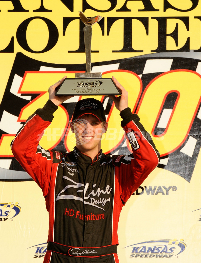 【9月28日 AFP】NASCAR・ネーションワイドシリーズ(2008 NASCAR Nationwide Series)第30戦、カンザス・ロッタリー300(Kansas Lottery 300)決勝。19番グリッドからスタートしたジョー・ギブス・レーシング/トヨタ(Joe Gibbs Racing Toyota)のデニー・ハムリン(Denny Hamlin)は、同シリーズでのシーズン4勝目を挙げ195ポイント(200周)を獲得した。(c)AFP/Getty Images