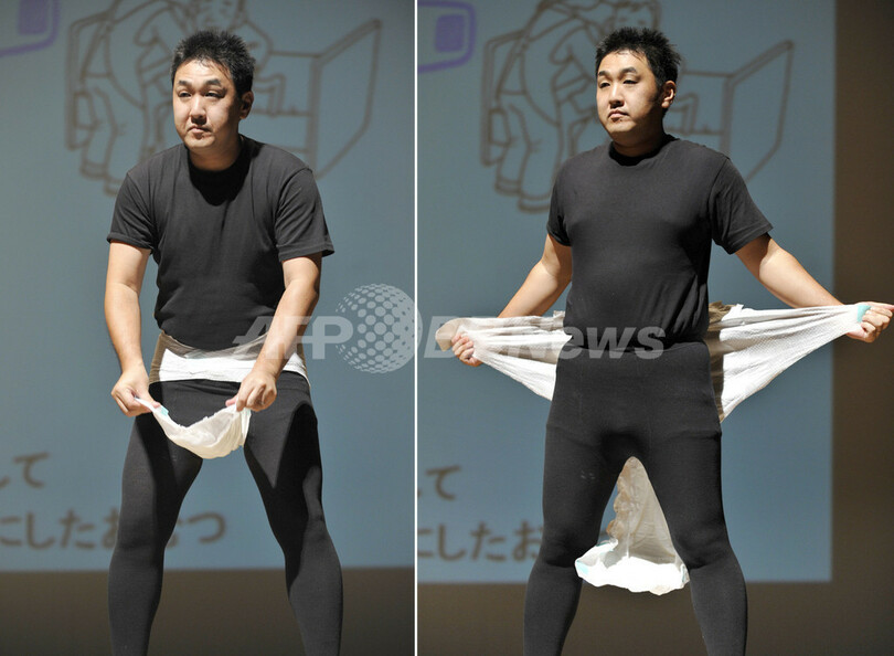 【9月29日 AFP】前週、都内で開かれたファッションショーでは、通常のファッションショーと同じような光景が見られた――ただある1点を除いて。1980年代の英米のロックミュージックなどに合わせ、さっそうと歩くモデルたちが黒のストッキングの上に着用していたのは、大人用おむつだった。