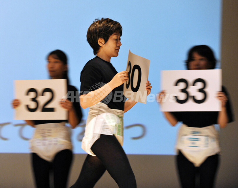 【9月29日 AFP】前週、都内で開かれたファッションショーでは、通常のファッションショーと同じような光景が見られた――ただある1点を除いて。1980年代の英米のロックミュージックなどに合わせ、さっそうと歩くモデルたちが黒のストッキングの上に着用していたのは、大人用おむつだった。