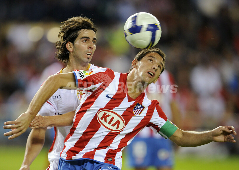 【9月29日 AFP】08-09スペイン1部リーグ第5節、アトレティコ・マドリード(Atletico de Madrid)対セビージャFC(Sevilla FC)。試合は前半21分にルイス・ファビアーノ(Luis Fabiano)がフリーキックを直接ゴールに決めて先制したセビージャが1-0でアトレティコ・マドリードを下し、セビージャは首位に立つバレンシア(Valencia CF)と勝ち点2差で4位に順位を上げた。(c)AFP/Phil Seery