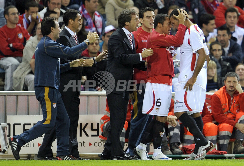 【9月29日 AFP】08-09スペイン1部リーグ第5節、アトレティコ・マドリード(Atletico de Madrid)対セビージャFC(Sevilla FC)。試合は前半21分にルイス・ファビアーノ(Luis Fabiano)がフリーキックを直接ゴールに決めて先制したセビージャが1-0でアトレティコ・マドリードを下し、セビージャは首位に立つバレンシア(Valencia CF)と勝ち点2差で4位に順位を上げた。(c)AFP/Phil Seery