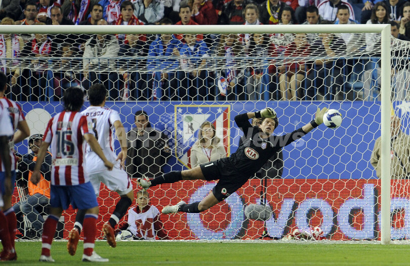 【9月29日 AFP】08-09スペイン1部リーグ第5節、アトレティコ・マドリード(Atletico de Madrid)対セビージャFC(Sevilla FC)。試合は前半21分にルイス・ファビアーノ(Luis Fabiano)がフリーキックを直接ゴールに決めて先制したセビージャが1-0でアトレティコ・マドリードを下し、セビージャは首位に立つバレンシア(Valencia CF)と勝ち点2差で4位に順位を上げた。(c)AFP/Phil Seery