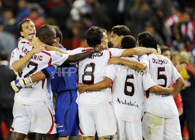 【9月29日 AFP】08-09スペイン1部リーグ第5節、アトレティコ・マドリード(Atletico de Madrid)対セビージャFC(Sevilla FC)。試合は前半21分にルイス・ファビアーノ(Luis Fabiano)がフリーキックを直接ゴールに決めて先制したセビージャが1-0でアトレティコ・マドリードを下し、セビージャは首位に立つバレンシア(Valencia CF)と勝ち点2差で4位に順位を上げた。(c)AFP/Phil Seery