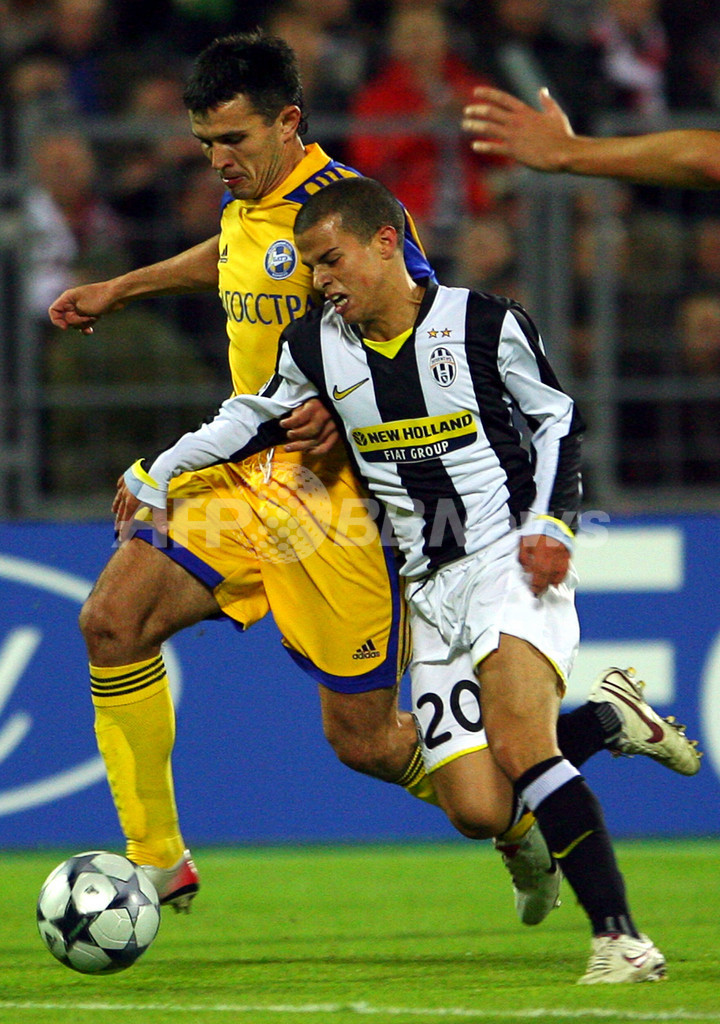 【10月1日 AFP】(写真追加、記事更新)サッカー欧州チャンピオンズリーグ2008-09(UEFA Champions League 2008-09)グループリーグH第2節、BATEボリソフ(BATE Borisov)対ユベントス(Juventus)。試合はユベントスが2点のリードを許したが、ビンチェンツォ・イアクインタ(Vincenzo Iaquinta)が前半29分と同ロスタイムにゴールを決めて2-2の引き分けに終わった。(c)AFP/Pirate Irwin