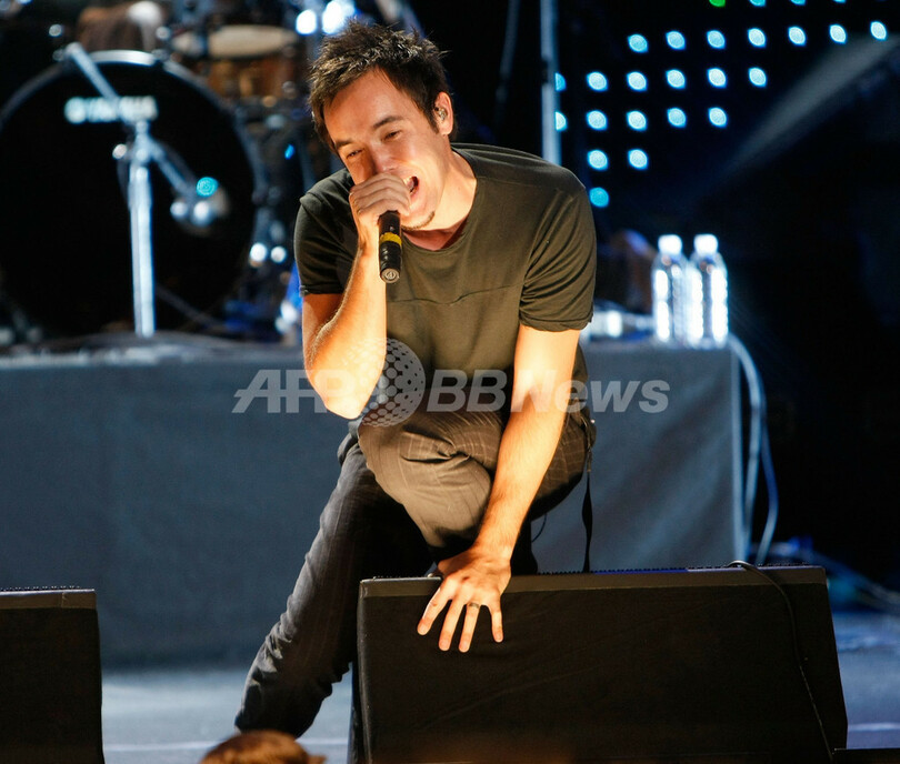 米カリフォルニア(California)州ロサンゼルス(Los Angeles)のウィルターン・シアター(Wiltern Theater)でパフォーマンスを披露する、米ロックバンド「フーバスタンク(Hoobastank)」のボーカリスト、ダグラス・ロブ(Doug Robb、2008年9月29日撮影)。(c)AFP/Getty Images/Michael Buckner
