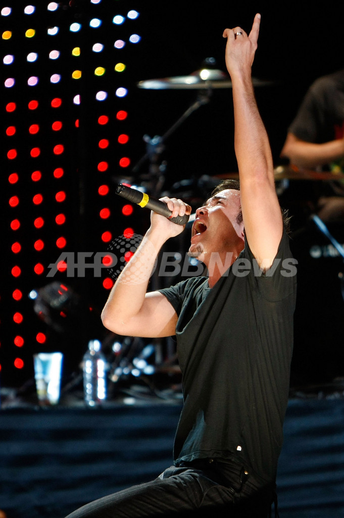 米カリフォルニア(California)州ロサンゼルス(Los Angeles)のウィルターン・シアター(Wiltern Theater)でパフォーマンスを披露する、米ロックバンド「フーバスタンク(Hoobastank)」のボーカリスト、ダグラス・ロブ(Doug Robb、2008年9月29日撮影)。(c)AFP/Getty Images/Michael Buckner