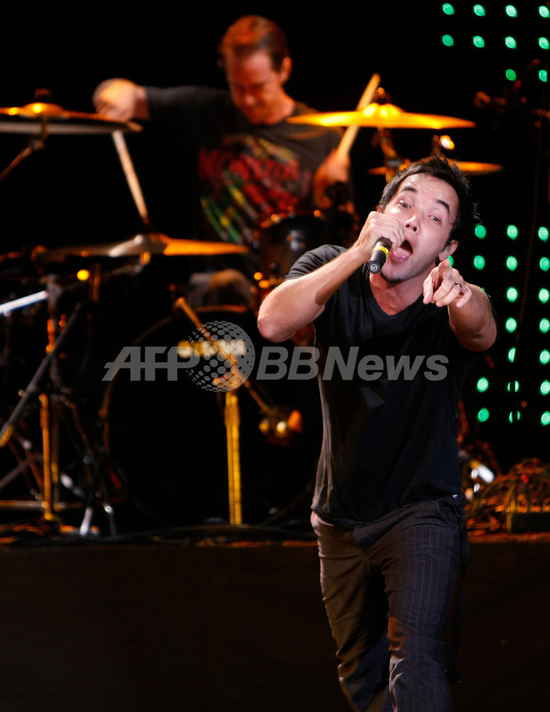 米カリフォルニア(California)州ロサンゼルス(Los Angeles)のウィルターン・シアター(Wiltern Theater)でパフォーマンスを披露する、米ロックバンド「フーバスタンク(Hoobastank)」のボーカリスト、ダグラス・ロブ(Doug Robb、2008年9月29日撮影)。(c)AFP/Getty Images/Michael Buckner