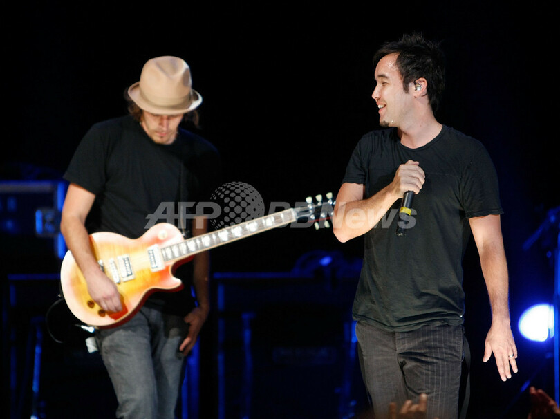 米カリフォルニア(California)州ロサンゼルス(Los Angeles)のウィルターン・シアター(Wiltern Theater)でパフォーマンスを披露する、米ロックバンド「フーバスタンク(Hoobastank)」のギタリスト、ダン・エストリン(Dan Estrin、左)とボーカリストのダグラス・ロブ(Douglas Robb、2008年9月29日撮影)。(c)AFP/Getty Images/Michael Buckner