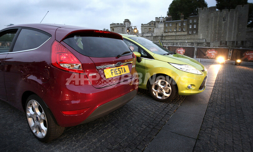 英ロンドン(London)中心部のロンドン塔(London Tower)で披露された米自動車大手フォード・モーター(Ford Motor)の新型「フィエスタ(Ford Fiesta)」(2008年9月30日撮影)。(c)AFP/Shaun Curry