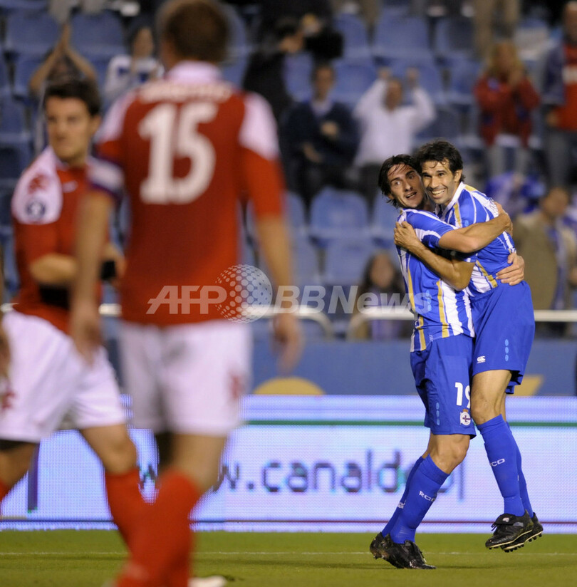 【10月3日 AFP】サッカーUEFA杯2008-09(UEFA Cup 2008-09)1回戦、デポルティボ・ラ・コルーニャ(Deportivo La Coruna)対SKブラン(SK Brann)第2戦。試合はデポルティボ・ラ・コルーニャが2-0で勝利を挙げ、2試合合計スコアを2-2の同点とし、そのまま延長でも決着つかず迎えたペナルティーキック(PK)戦でデポルティボ・ラ・コルーニャが3-2で勝利した。(c)AFP