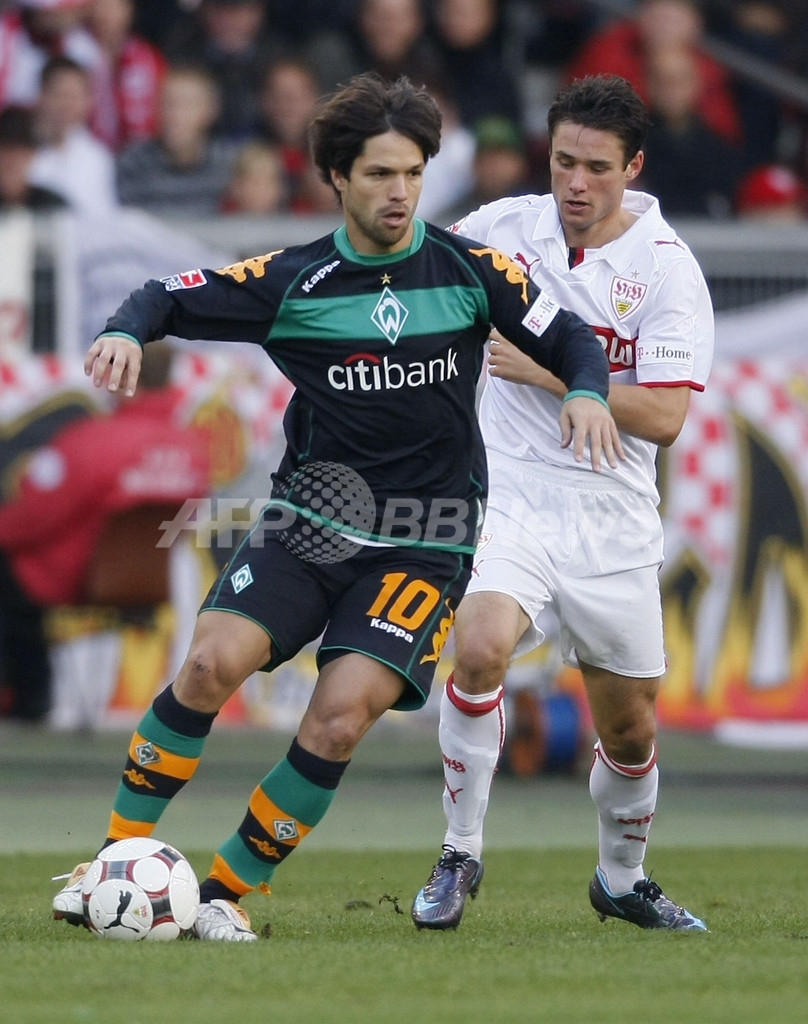 ブレーメンは後半18分にロベルト・ヒルベルト(Roberto Hilbert)にゴールを奪われ0-3とされたが、その2分後にジエゴ・リバス(Diego Ribas)がフリーキックを直接ゴールに決めて1点を返した。しかし、後半43分にはマルティン・ラニヒ(Martin Lanig)にゴールを決められブレーメンは4失点を喫した。(c)AFP/Ryland James