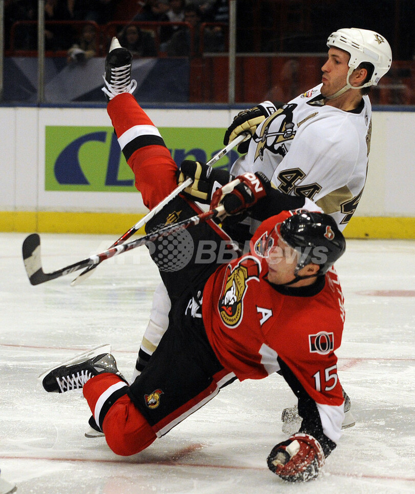スポーツ ウインタースポーツ ペンギンズ OTでセネターズを下し白星スタート 2008年10月5日 10:08 発信地:ストックホルム/ノルウェー [ ヨーロッパ ノルウェー ] このニュースをシェア ‹ › ❮ 8/11 ❯ オタワ・セネターズのダニー・ヒートリー(%%Dany Heatley%%、下)と競り合うピッツバーグ・ペンギンズのブルックス・オルピク(%%Brooks Orpik%%)。(2008年10月4日撮影)(c)AFP/OLIVIER MORIN 画像作成中 ! 【10月5日 AFP】08-09NHL、オタワ・セネターズ(Ottawa Senators)対ピッツバーグ・ペンギンズ(Pittsburgh Penguins)。試合はペンギンズが4-3でセネターズをオーバータイムの末に下し、シーズン初戦を白星で飾った。(c)AFP ウインタースポーツ 一覧へ> メディア・報道関係・法人の方向け 写真・動画 購入のお問合せ>