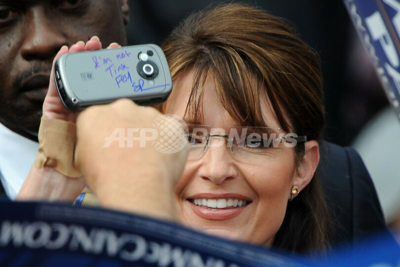 カリフォルニア(California)州カーソン(Carson)の選挙集会で、携帯電話にサインをして返す米大統領選挙の共和党副大統領候補、サラ・ペイリン(Sarah Palin)アラスカ(Alaska)州知事。携帯には、(ペイリン氏のものまねで人気の)「ティナ・フェイ(Tina Fey)じゃないわよ――SP(サラ・ペイリン)」の文字が見える(2008年10月4日撮影)。(c)AFP/Robyn BECK