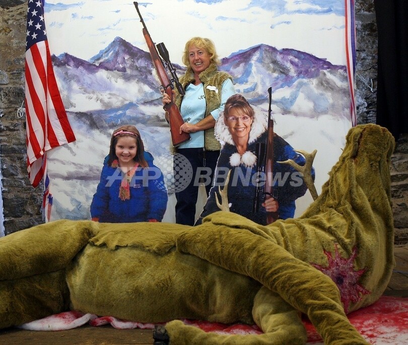 これはアーティストのDawn Robyn Petrlik氏の作品。ニューヨークのBrooklyn Waterfront Artists Coalition(ブルックリン・ウオーターフロント・アーティスト連合)に展示されている。来場者は、カリブーの狩猟場を再現した作品の中に立ち、段ボール紙でできた「ライフル」を手に携えフェイクファーのベストを着て、段ボール紙でできた「米大統領選挙の共和党副大統領候補サラ・ペイリン(Sarah Palin)氏」と、「娘のパイパー(Piper Palin)ちゃん」と一緒に記念撮影が出来る。ペイリン氏は狩猟が趣味。Petrlik氏はこれにインスピレーションを得て、この作品を制作したという。(c)AFP