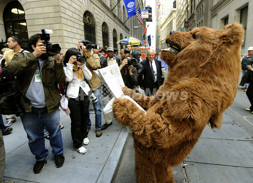 ニュース 政治・経済 こぼれ話 この株安にはクマったもんだ、NY証券取引所前にクマ現る!? 2008年10月7日 16:25 発信地:ニューヨーク/米国 [ 北米 米国 ] このニュースをシェア ‹ › ❮ 4/5 ❯ ニューヨーク証券取引所(New York Stock Exchange、NYSE)前に現れた着ぐるみのクマ(2008年10月6日撮影)。(c)AFP/TIMOTHY A. CLARY 画像作成中 ! 【10月7日 AFP】4年ぶりにダウ工業株30種平均(Dow Jones Industrial Average)が1万ドル割れするなど混乱が続くニューヨーク証券取引所(New York Stock Exchange、NYSE)前に、「ベア・マーケット(bear market、「下げ相場」の意)」を表現した、着ぐるみのクマが登場した。(c)AFP 政治・経済 一覧へ> メディア・報道関係・法人の方向け 写真・動画 購入のお問合せ>
