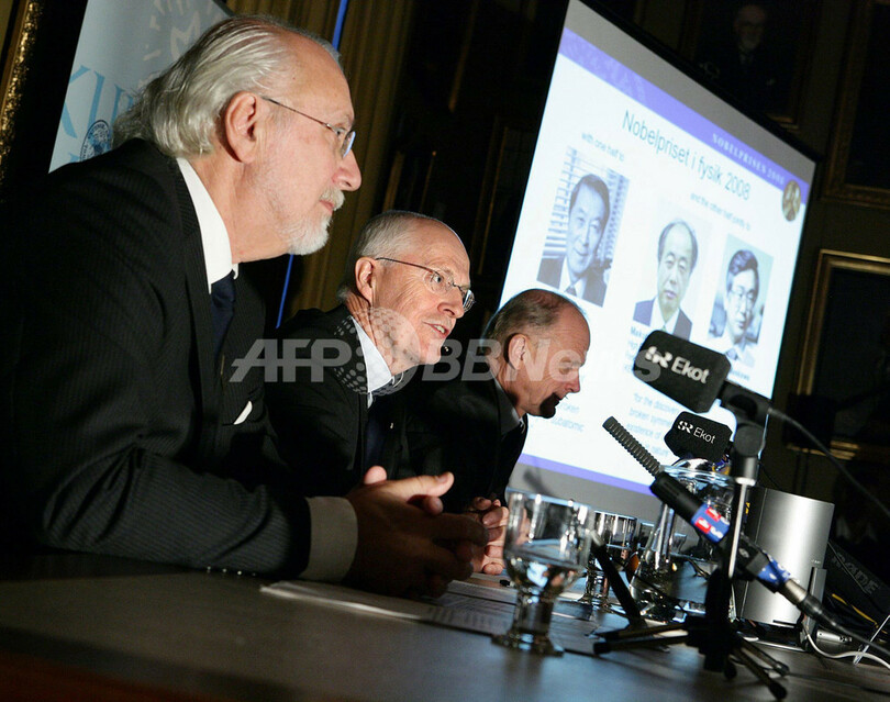 【10月7日 AFP】スウェーデン王立科学アカデミーは7日、2008年のノーベル物理学賞を小林誠(Makoto Kobayashi)高エネルギー加速器研究機構(KEK)名誉教授(64)、益川敏英(Toshihide Maskawa)京都産業大学教授(68)、南部陽一郎(Yoichiro Nambu)米シカゴ大名誉教授(87、米国籍)の3氏に授与すると発表した。