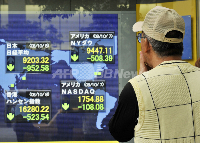 ニュース 政治・経済 日経平均暴落、終値952円安 20年ぶり下落率 2008年10月8日 17:51 発信地:東京 [ アジア・オセアニア 東京 ] このニュースをシェア ‹ › ❮ 3/6 ❯ 都内の株価掲示板を見つめる男性(2008年10月8日撮影)。(c)AFP/Yoshikazu TSUNO 画像作成中 ! 【10月8日 AFP】(写真追加)8日の東京株式市場は、世界的な金融不安の拡大で全面安となり、日経平均株価は前日比952円58銭(9.38%)安の9203円32銭で引け、14.9%安を記録した1987年10月20日のブラックマンデー(Black Monday)以来、約20年ぶりに最大の下落率を記録した。(c)AFP 政治・経済 一覧へ> メディア・報道関係・法人の方向け 写真・動画 購入のお問合せ>