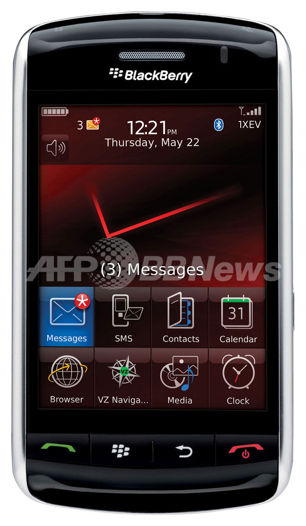 「ブラックベリー・ストーム」は、米国では米携帯電話大手のベライゾン・ワイヤレス(Verizon Wireless)を通じて提供され、欧州、インド、オーストラリア、ニュージーランドでは同英大手ボーダフォン(Vodafone)を通じて提供される。(c)AFP
